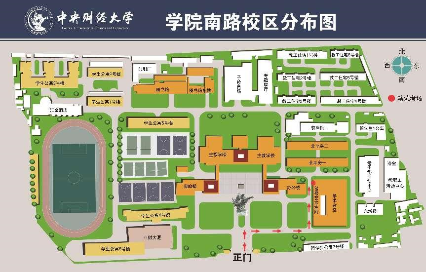 考场路线:进入正门后可沿下图红色虚线指引到达学术会堂北门,乘坐电梯到达二层202考场或四层402考场。