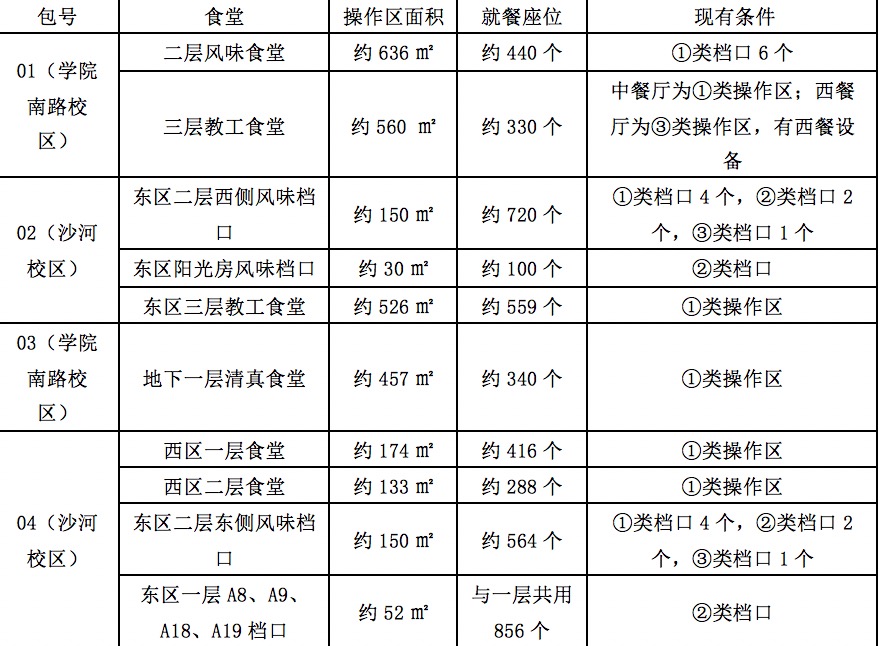 注:上表数据仅供参考,现场情况均以踏勘为准。①类操作区/档口,供电,排风和燃气灶齐全;②类档口,有供电,无排风无燃气灶;③类档口,有供电,有排风无燃气灶。面积及座位数以现场测量及现场桌椅摆放数为准。